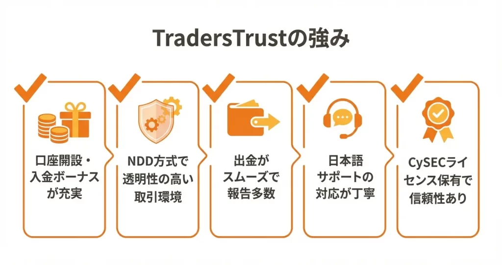 TradersTrustは海外FX業者の中でも、ボーナス制度・取引環境・出金対応の面で評価を受けています。