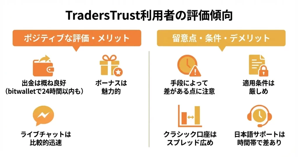 業者の基本情報を把握したところで、次に気になるのは実際の利用者がどのような評価をしているかという点です。次のセクションでは、良い評判と悪い評判の両面から、TradersTrustの実態を確認していきます。