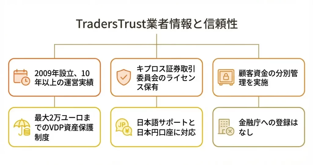 なおTradersTrustはキプロス証券取引委員会(CySEC)のライセンスを保有しており、金融規制当局の監督下で運営されている点は、業者選定における信頼性の判断材料となります。