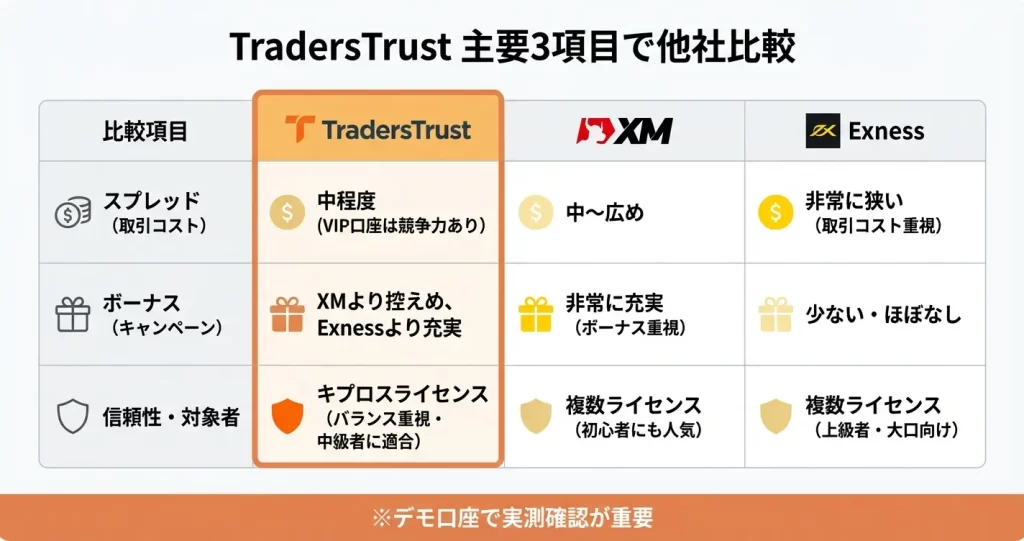 ボーナス重視で取引コストを相殺したい場合はTradersTrustが適しており、スプレッドの狭さを最優先する場合は他社も検討する価値があります。