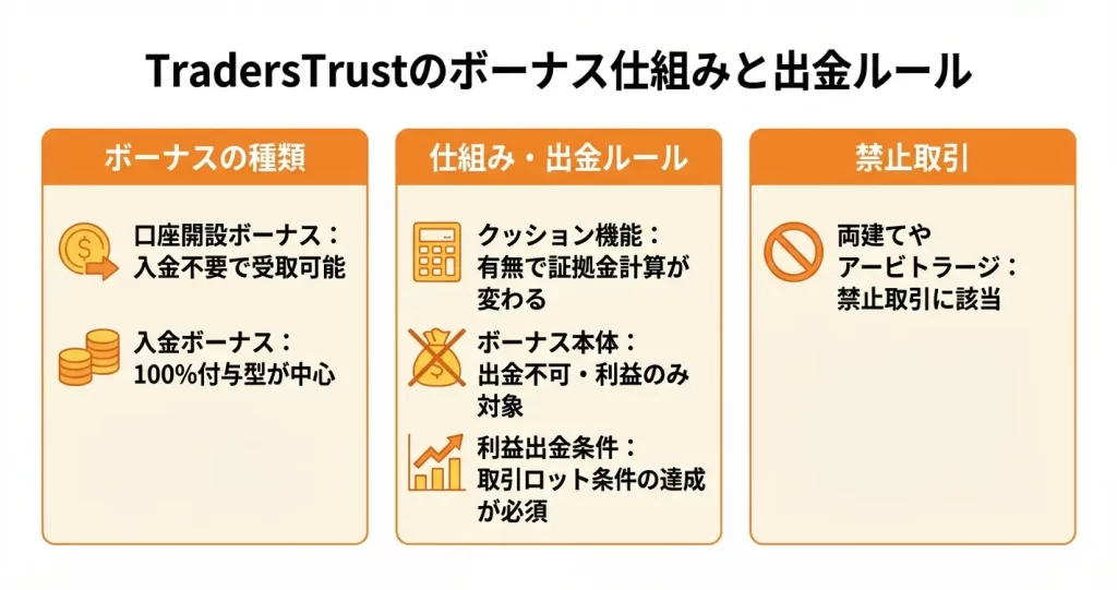 ここでは実際の利用者が評価しているポイントを整理し、他社と比較した際の具体的な優位性を確認していきます。ボーナス制度・取引環境・出金対応・サポート品質という4つの観点から、TradersTrustのメリットを見ていきましょう。