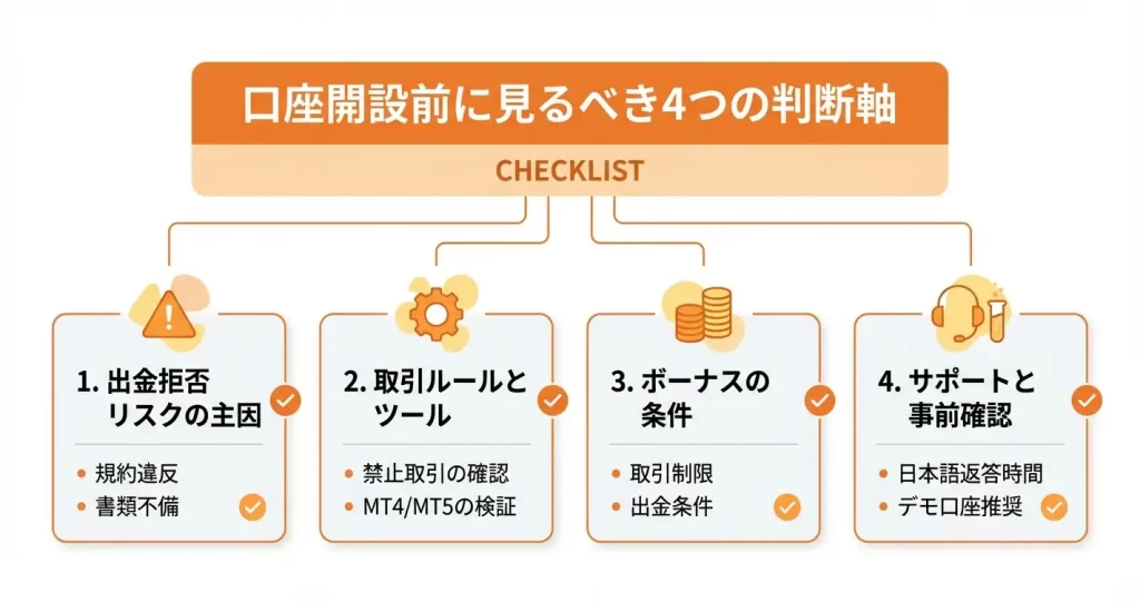 口座開設は簡単ですが、実際に安心して取引を続けられるかは、これらの確認項目を事前にクリアしているかで大きく変わります。