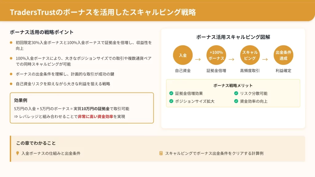 100%入金ボーナスで証拠金を倍増させて、より安全なスキャルピングが可能です。