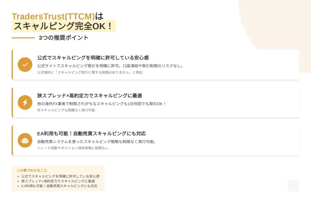 TradersTrust(TTCM)はスキャルピング完全OK!3つの推奨ポイント
