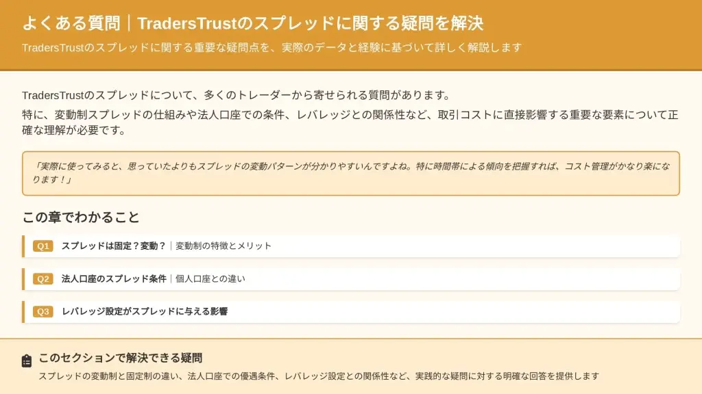 本セクションでは、TradersTrustを利用する上で知っておくべきスプレッド関連の重要事項を、Q&A形式で分かりやすく解説していきます。