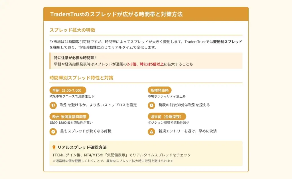 • 早朝(5:00-7:00):全通貨ペアでスプレッド拡大、通常の2-3倍に
