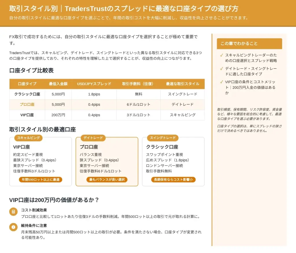 この記事を読めば、あなたの取引スタイルに最適なTradersTrustの口座タイプを選択し、スプレッドコストを最小化した効率的な取引戦略を構築できるようになります。