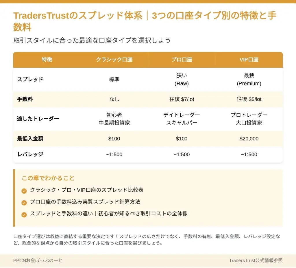 TradersTrustのスプレッド体系|3つの口座タイプ別の特徴と手数料