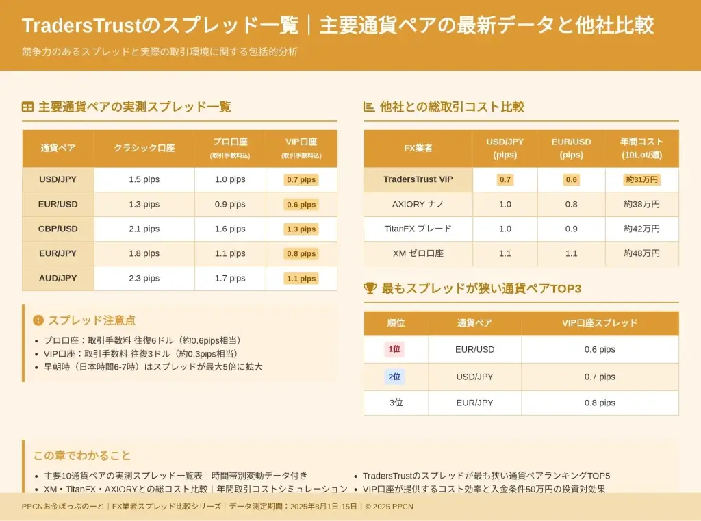 【2025年最新版】TradersTrustのスプレッド完全解説|主要10通貨ペアの実測データと他社比較で最適な口座選びまで