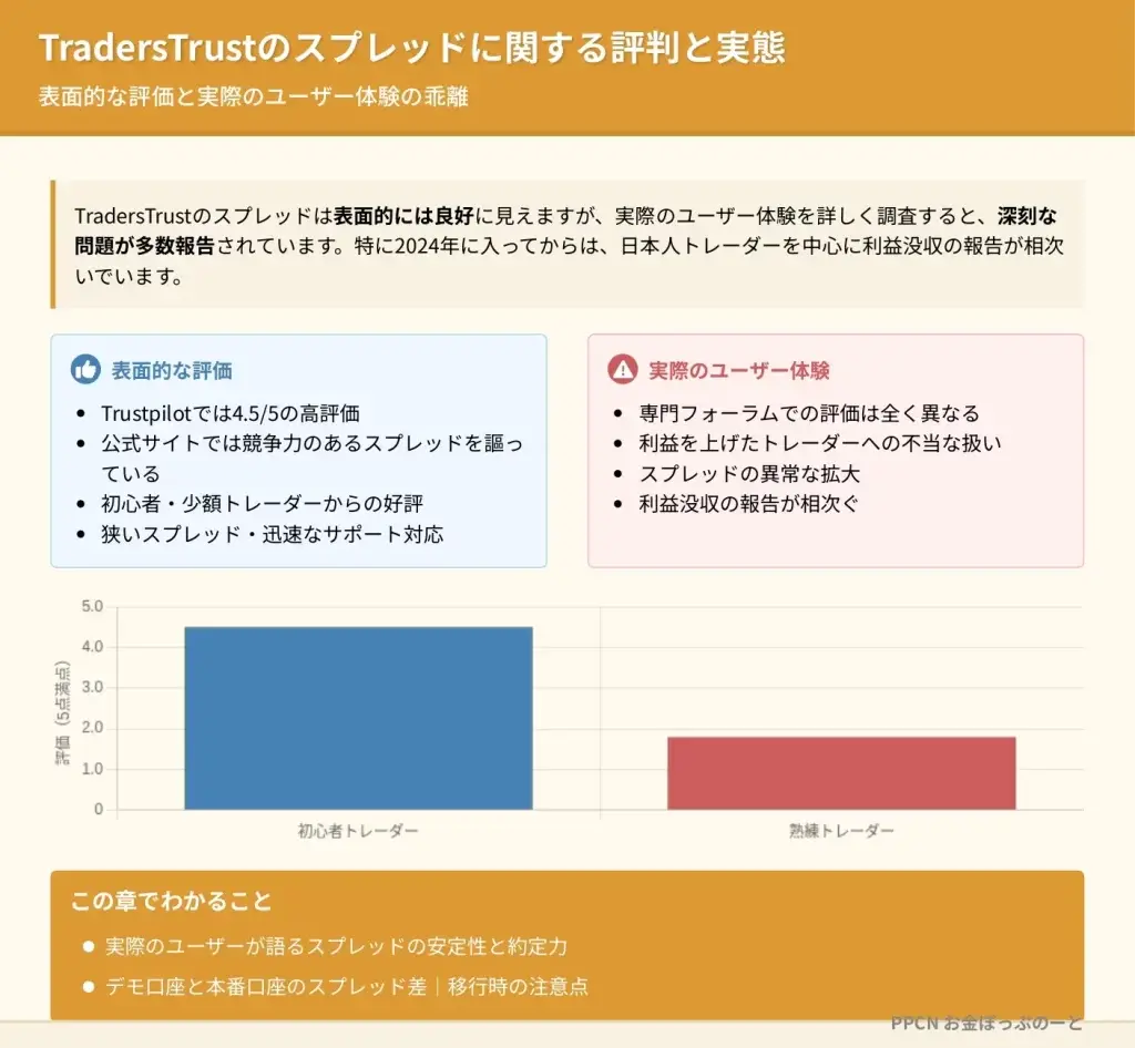 TradersTrust(TTCM)は競争力のあるスプレッドを提供していますが、実際の取引環境には注意すべき点が多数存在します。