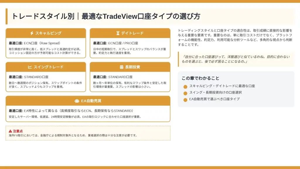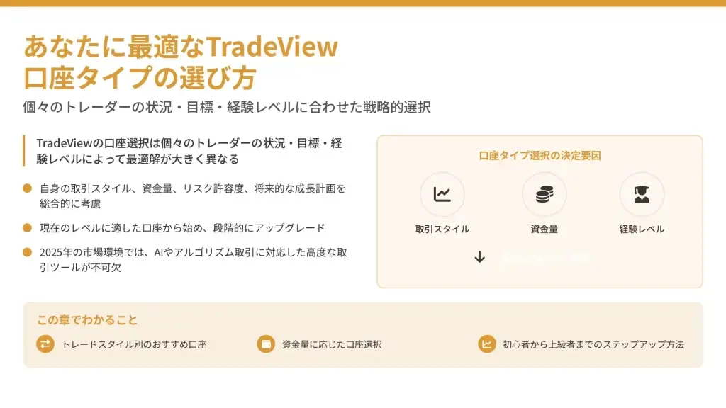 この記事では、TradeViewの全5種類の口座タイプの特徴を詳細な比較表とともに解説し、トレードスタイル別・資金量別の最適な口座選択方法をご紹介します。