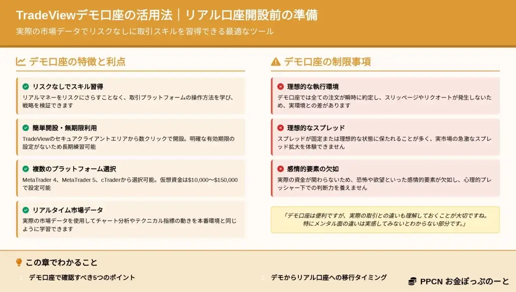 TradeViewのデモ口座は無期限で利用可能なため、永続的な練習環境として活用できる貴重なツールとなります。