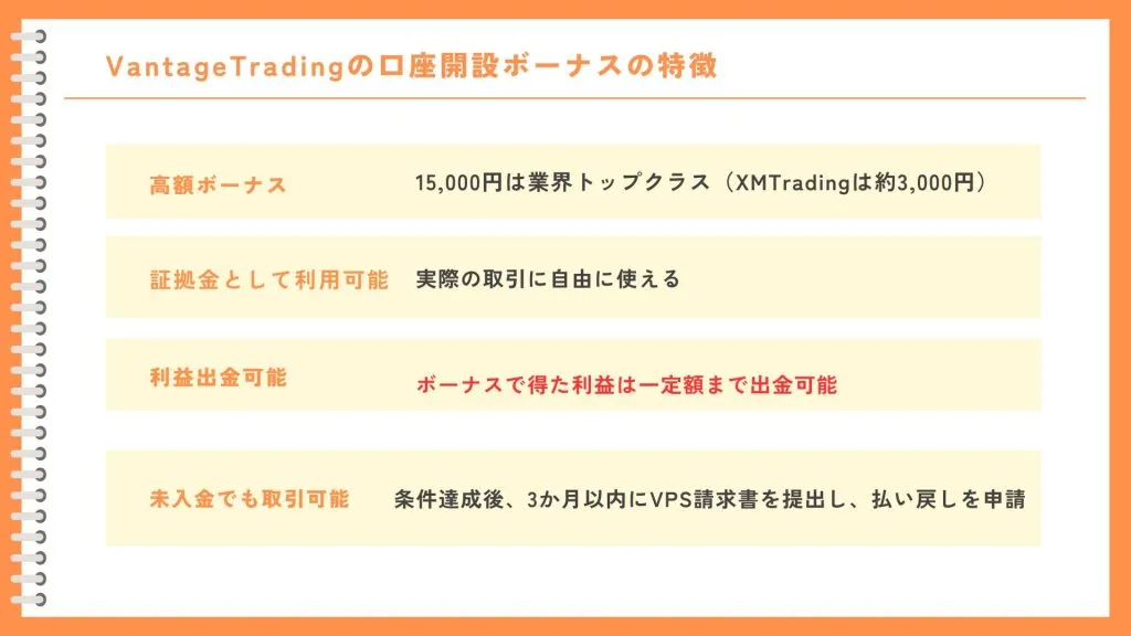 Vantage | 15,000円 | 常時開催 | 業界最高水準の恒常的なボーナス |