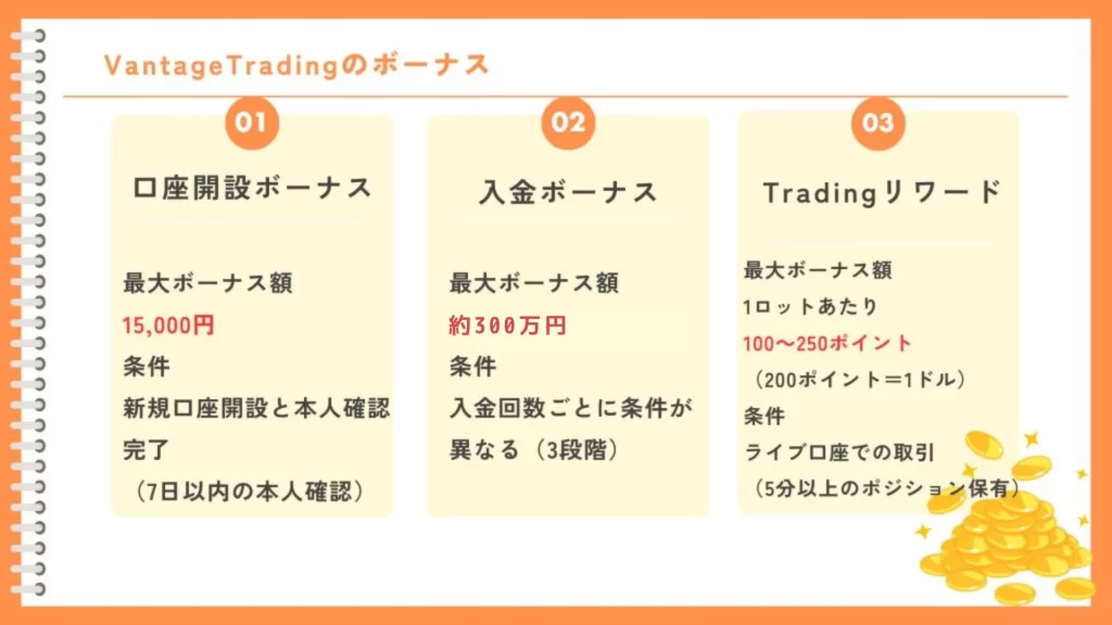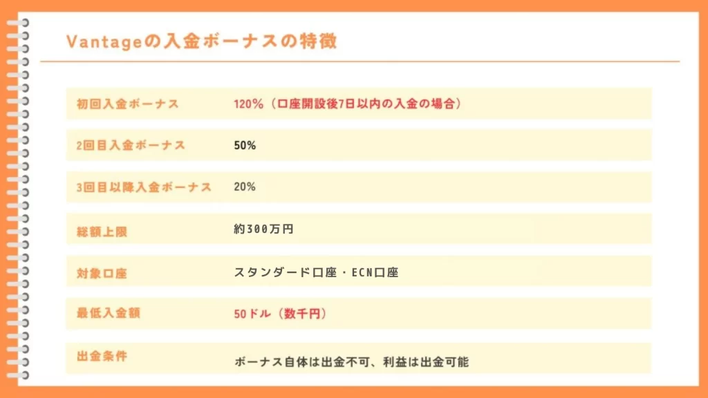ここではVantageのボーナス内容を一覧で整理し、それぞれのボーナスを受け取る条件と金額、さらにvantage ボーナス 出金条件(ボーナスの出金に関する条件)について解説します。