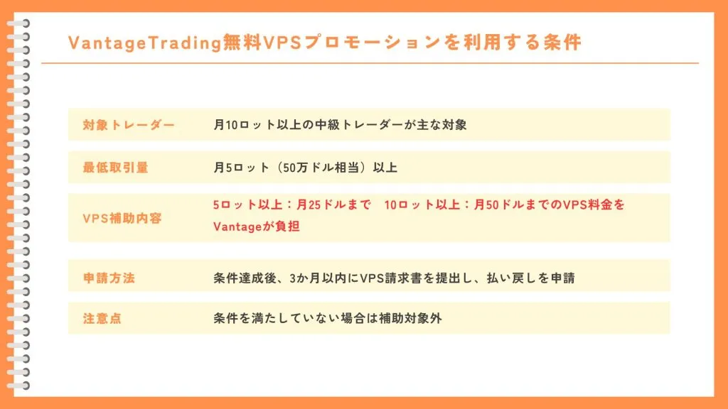 VPS無料 プロモーション | 自動売買に便利なVPSの利用料補助 | 口座残高1,000ドル相当以上 月間取引量により補助額が変動 | 月5ロット:25ドル補助 月10ロット以上:50ドル補助 |