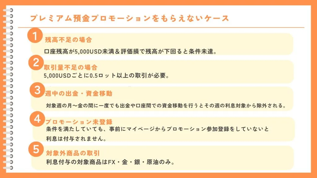 プレミアム預金 プロモーション | 口座残高に対する高金利サービス | 口座残高5,000ドル以上 毎週5,000ドルにつき0.5ロット以上の取引 | 最大年利13% (日利0.05%、週0.25%) |