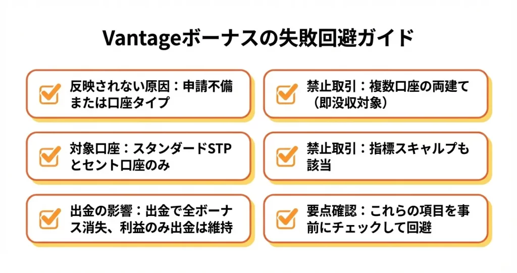 Vantageのボーナスは「確実に受け取れて、現実的に出金を目指せる」設計であることが分かりました。次のセクションでは、ボーナスを申し込む前に確認すべき注意点と、よくある質問への回答をまとめます。