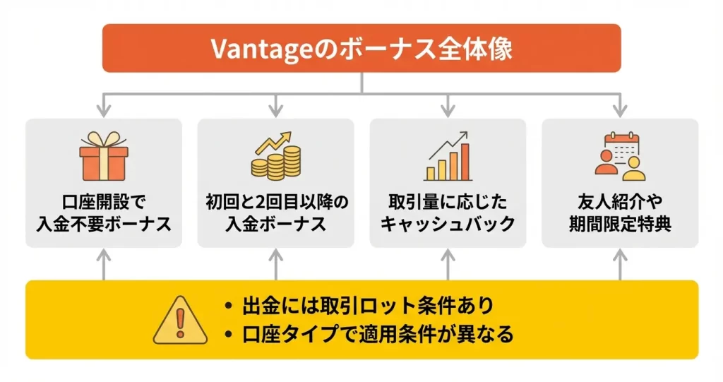 Vantageボーナスの種類と受取条件を徹底解説、出金要件まで完全網羅