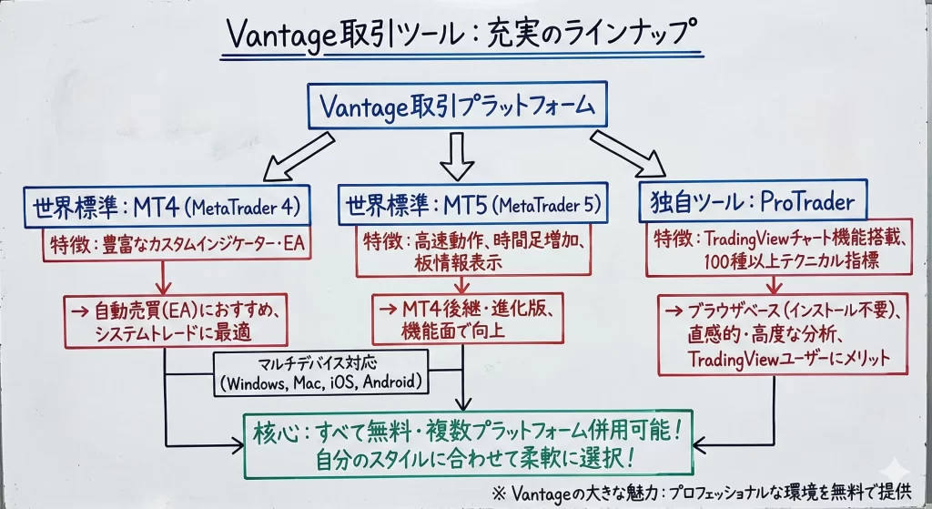 MT4やMT5は世界標準のプラットフォームですが、Vantage独自のサーバー設定や注文方式に慣れる必要があります。