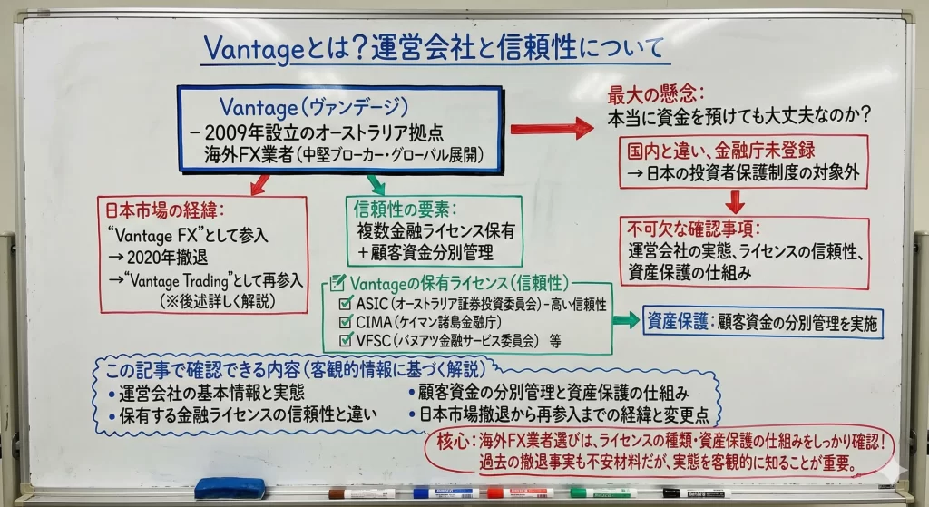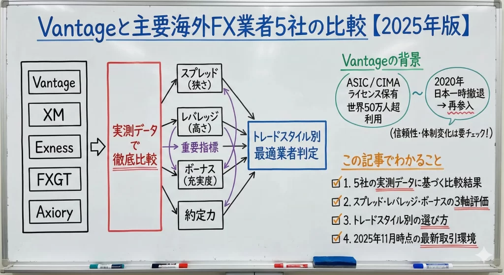 特にVantageは2020年に一度日本市場から撤退した経緯があり、再参入後の運営体制や取引条件がどう変わったのか、他の海外FX業者(XMやExnessなど)と比べて本当に優れているのかを判断する材料が必要です。