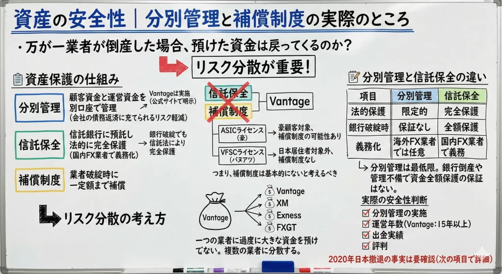 Vantageは顧客資金を分別管理していますが、第三者機関による信託保全は実施していません。