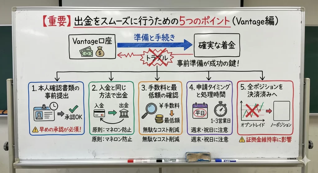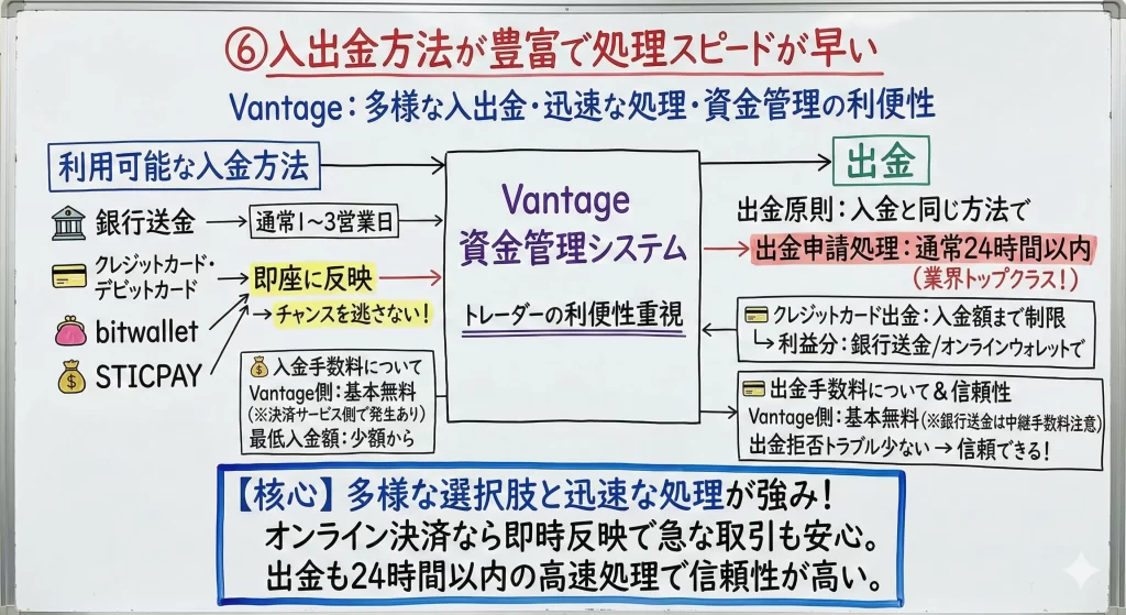 Vantageの公式発表では、出金申請は24時間以内に処理され、銀行送金の場合は2~5営業日で着金するとされています。