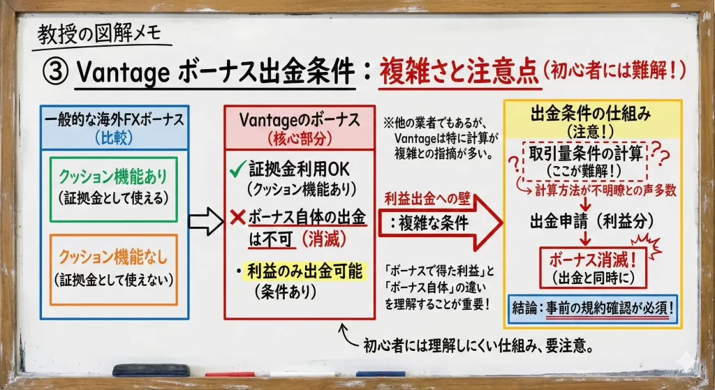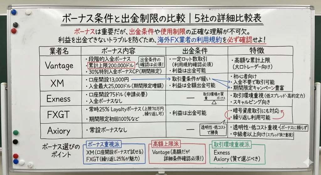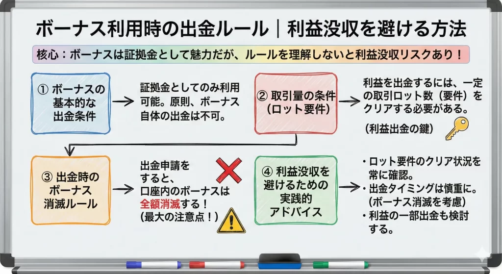 ボーナスには出金制限や取引量条件が付随することが多く、実質的な資金効率が見かけ上より低いケースもあります。