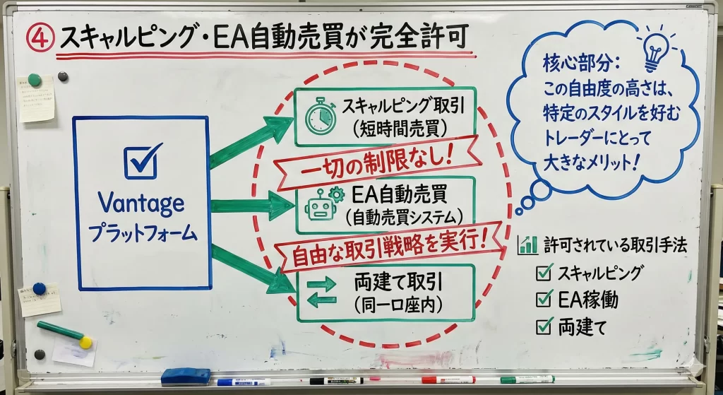 VantageではMetaTrader 4/5でのEA利用が完全に認められており、スキャルピングEAや高頻度取引ボットの稼働も制限されていません。
