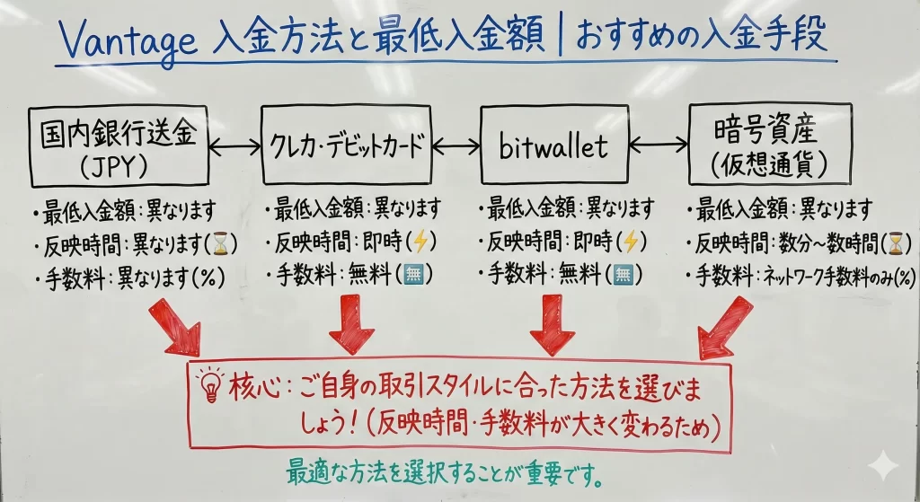 入出金方法については、事前に自分の銀行口座やクレジットカードがVantageで利用可能か確認しておくことをおすすめします。