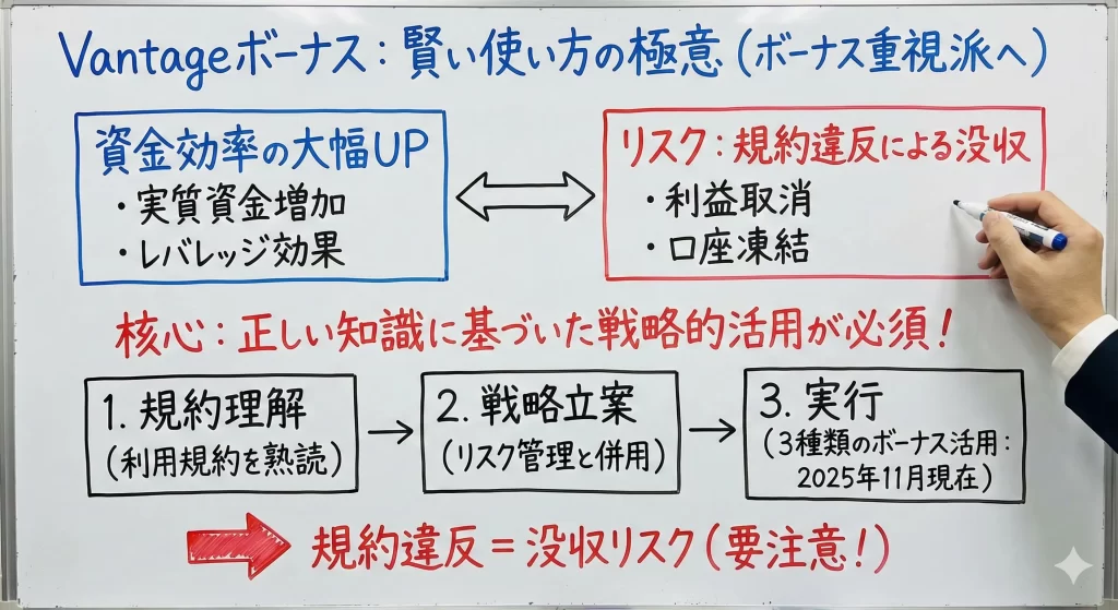 XMでボーナスを活用した少額トレードを行いながら、Vantageで本格的な資金を低コストで運用するといった使い分けが効果的です。