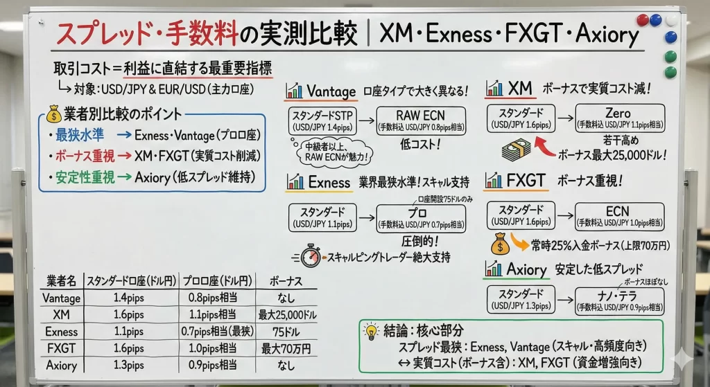 XMのゼロ口座(ドル円平均0.1pips+手数料往復10ドル)やExnessのプロ口座(ドル円平均0.7pips・手数料無料)と比較しても、総合的な取引コストでは優位性があります。