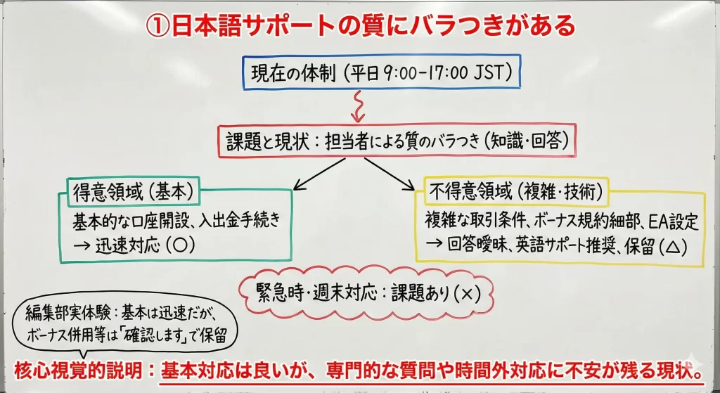 急な出金トラブルや取引上の疑問が深夜に発生した場合、即座に日本語で問い合わせできない点は初心者にとってデメリットです。