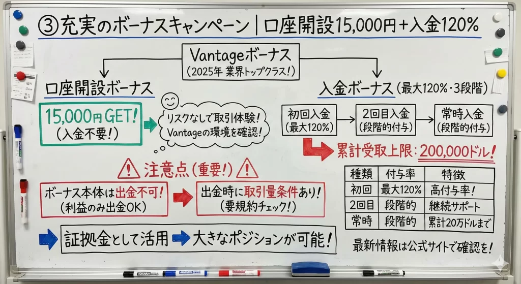 Vantageは最大120%の初回入金ボーナスに加え、継続入金ボーナスやキャッシュバックプログラムを提供しています。