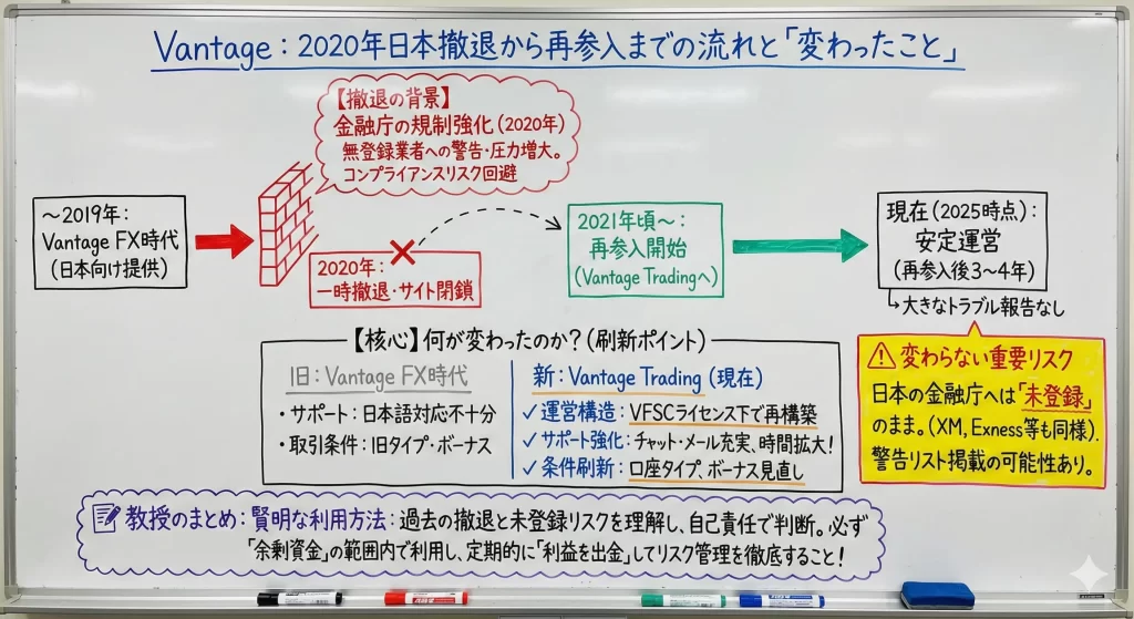 2022年8月の再参入時には「Vantage Japan」としてサービスを刷新し、日本語サポート体制の強化やボーナスキャンペーンの拡充を図っています。