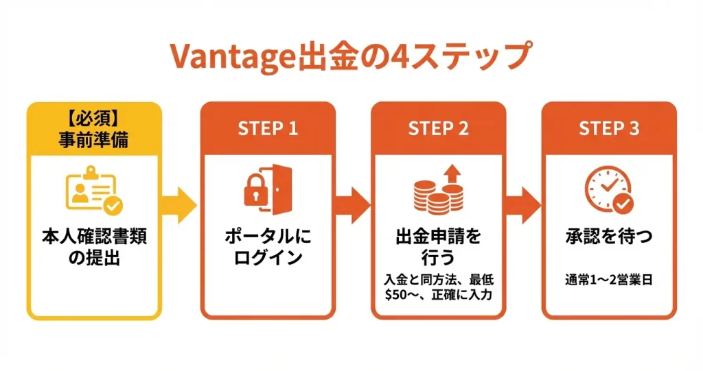 次のセクションでは、Vantageの管理画面から出金申請を完了するまでの具体的な流れを解説します。