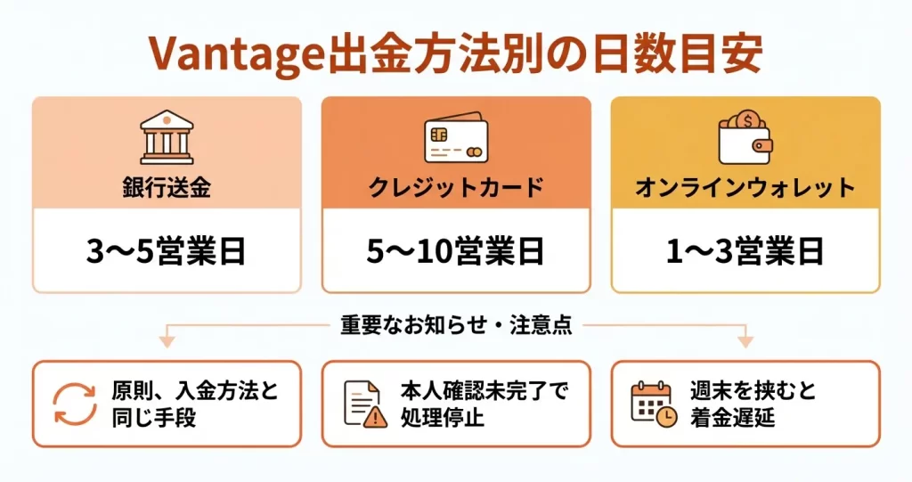 Vantageでは、出金申請から実際に着金するまでの期間として数営業日程度を見込む必要があります。