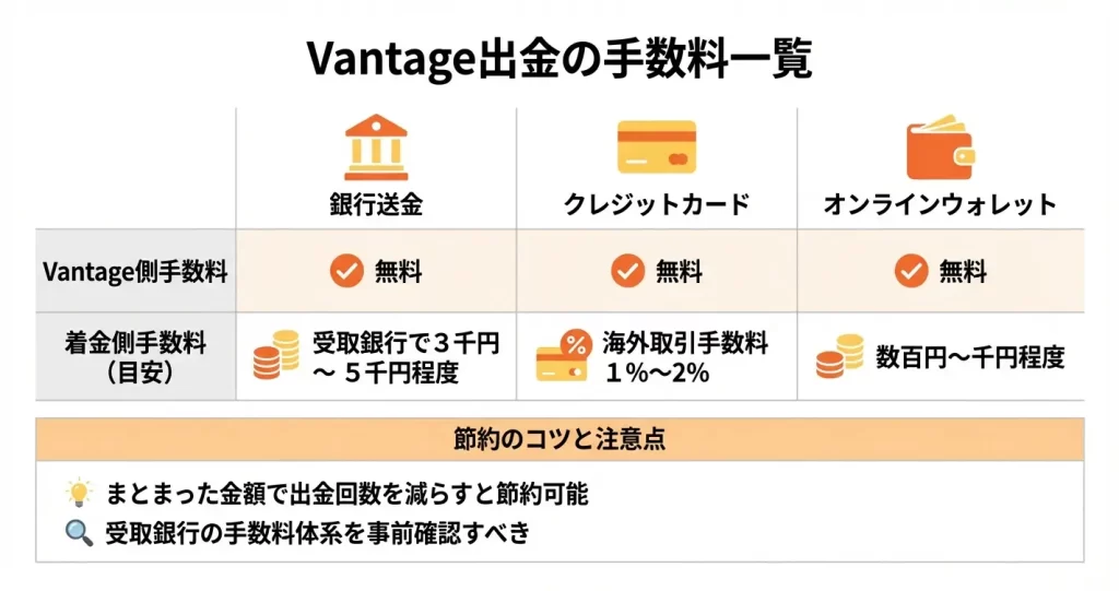 Vantage側の出金手数料は無料ですが、ウォレットから銀行口座への出金時にウォレット側の手数料が発生する点には留意が必要です。