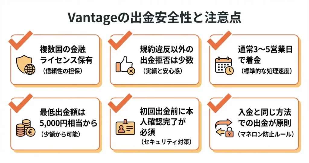 Vantageは金融ライセンスを保有し、規約に沿った利用であれば出金に応じる体制を整えています。