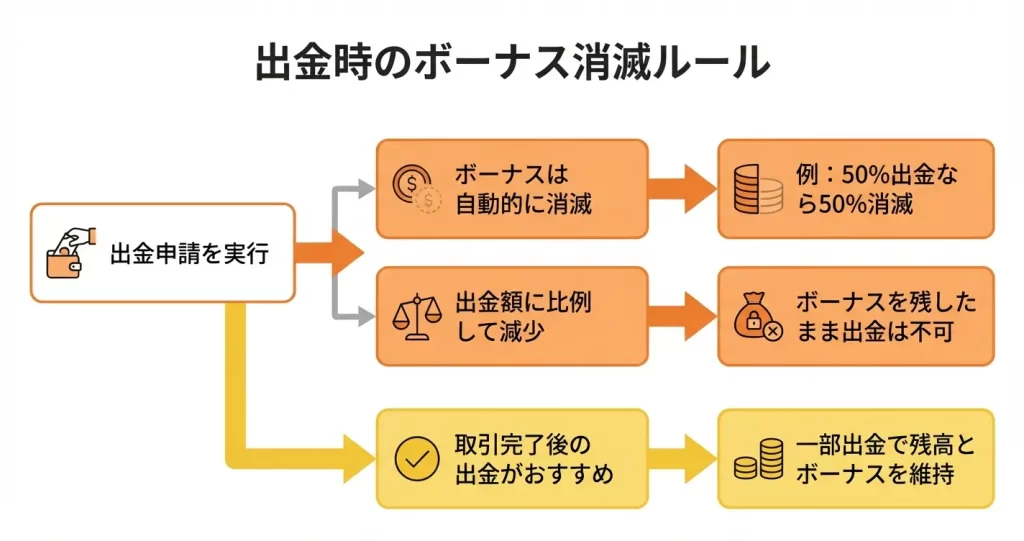 具体的には、口座残高に対する出金額の割合に応じて、同じ割合のボーナスが自動的に削除されます。