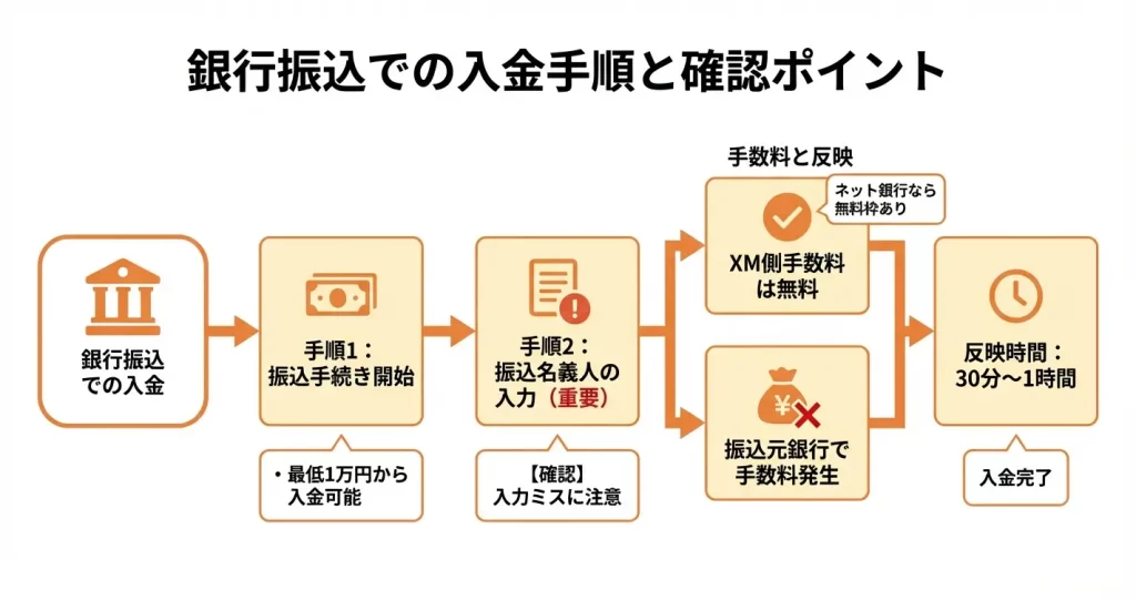 国内銀行送金は、日本国内の金融機関から直接XMの指定口座に振り込む方法で、銀行営業日に依存します。