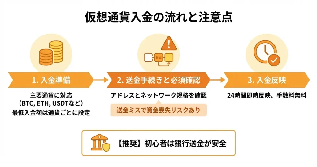 仮想通貨による入金も可能で、利用者の状況に応じて選択できる仕組みになっています。