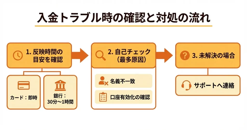 入金トラブルの多くは確認不足や待ち時間の誤認によるものです。まずは上記の確認手順を一つずつ実施し、それでも解決しない場合は必要な情報を整理したうえでサポートへ連絡しましょう。