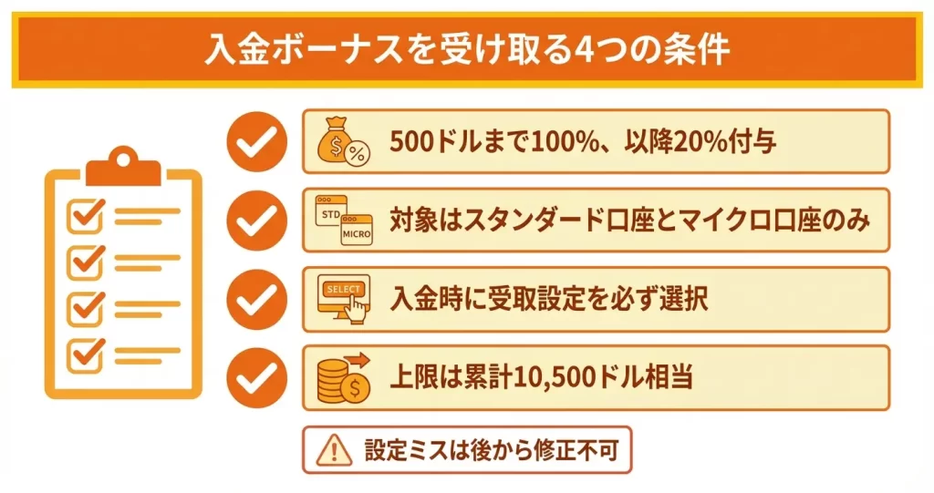 特にボーナス対象口座とボーナス対象外口座を併用している場合、入金先を間違えるとボーナスが付与されないため、口座タイプと入金先の対応を事前に整理しておくことが重要です。