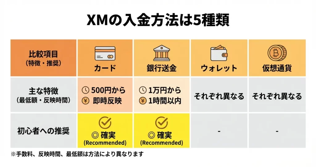 | 入金方法 | XM側手数料 | 反映時間 | 最低入金額 | 実質負担コスト |