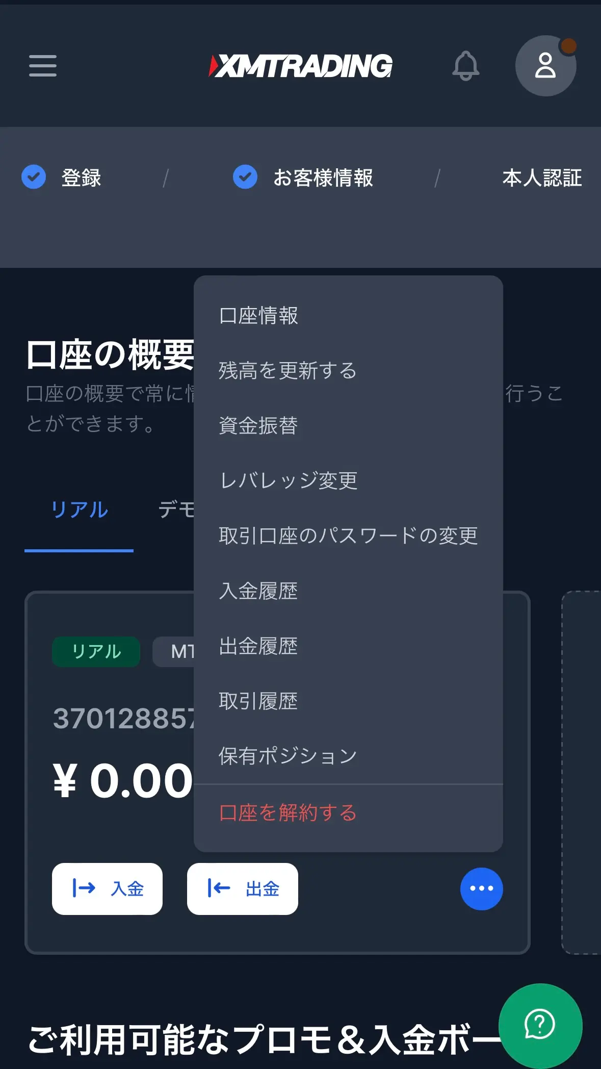 まずは、XMTradingの会員ページに「ログイン」して、レバレッジを確認したい口座の「メニューボタン」を押しましょう。