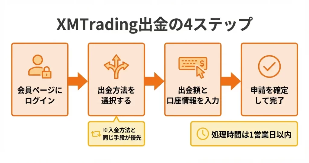 出金申請の画面操作は5分程度で完了し、その後XMTrading側で処理が行われます。このセクションでは、初めて出金する方でも迷わず手続きを進められるよう、実際の操作画面に沿って各ステップを順に解説します。