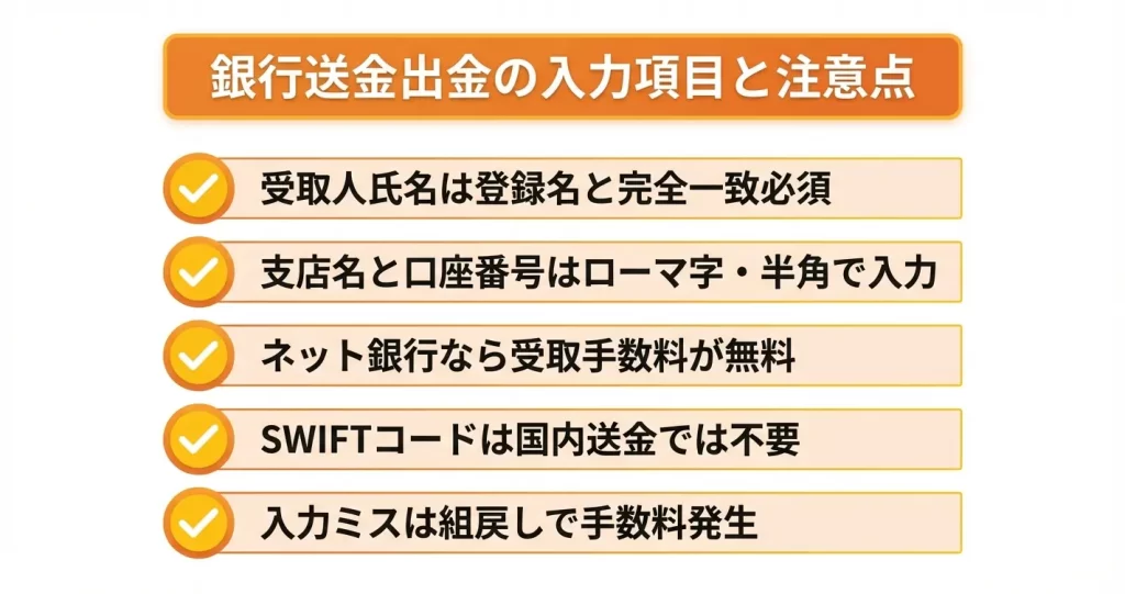 このセクションでは、銀行送金出金に必要な情報と、入力時に注意すべきポイントを具体的に解説します。