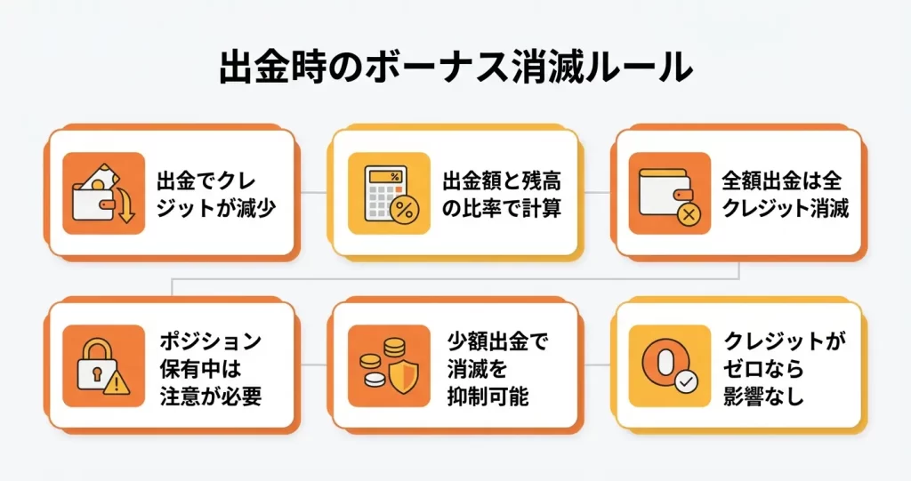 出金前の残高比率で計算されるため、利益だけを引き出したつもりでもボーナスは減少します。
