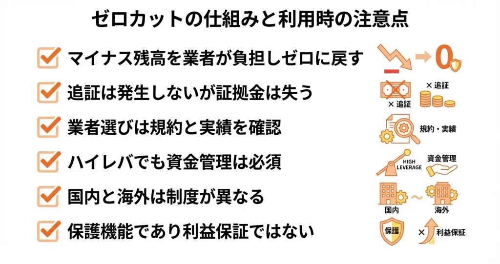 ゼロカットは「最悪の事態で追証請求を防ぐ最終的な保護機能」として捉え、日常的な資金管理を優先することが重要です。