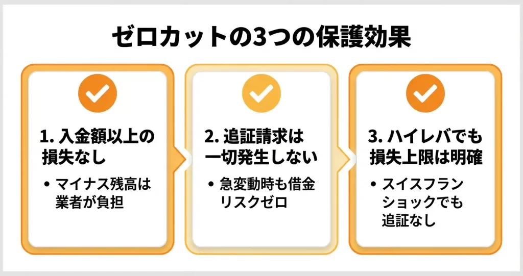 ゼロカットは「損失がゼロになる」のではなく「借金が発生しない」仕組みです。入金額までの損失リスクは残ります